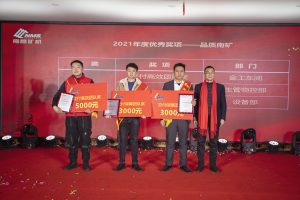 總結(jié)表彰大會上,南昌礦機(jī)為2021年度經(jīng)營發(fā)展做出突出貢獻(xiàn)的集體和個人進(jìn)行了表彰,先后頒發(fā)了《2021年度優(yōu)秀評選獎》科技南礦類、品質(zhì)南礦類、服務(wù)南礦類、國際南礦類、效益南礦類的優(yōu)秀團(tuán)隊(duì)及個人獎,“2021年度特別貢獻(xiàn)獎”,“南昌礦機(jī)2021年度金秋運(yùn)動會”團(tuán)隊(duì)及個人獎,進(jìn)行了2021年度快樂會議積分優(yōu)秀獎表彰和抽獎,開展了幸運(yùn)大抽獎及發(fā)紅包等活動,現(xiàn)場氣氛高漲不已。